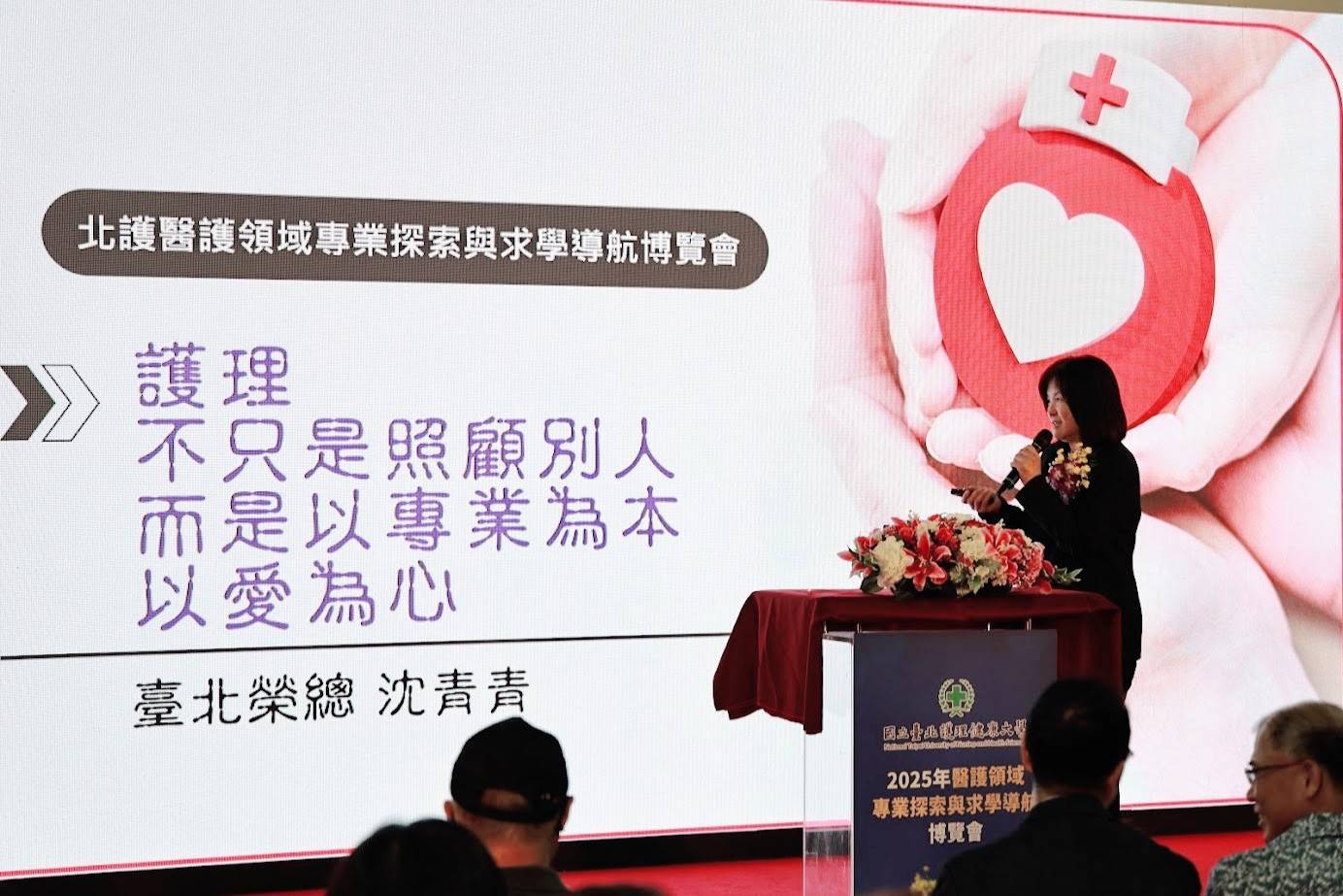 臺北榮民總醫院護理部主任沈青青,在活動中分享她41年的護理從業歷程。她表示,這不僅是歲月的堆疊,更是一段靈魂的淬鍊。她以自身的故事告訴大家:「護理是一越做越懂愛的工作,會看到生命的韌性。護理的價值,不在於生命的長度,而在於照亮生命的深度。」這段真摯的分享令在場師生深受感動,體現了護理工作的核心精神與人文厚度。