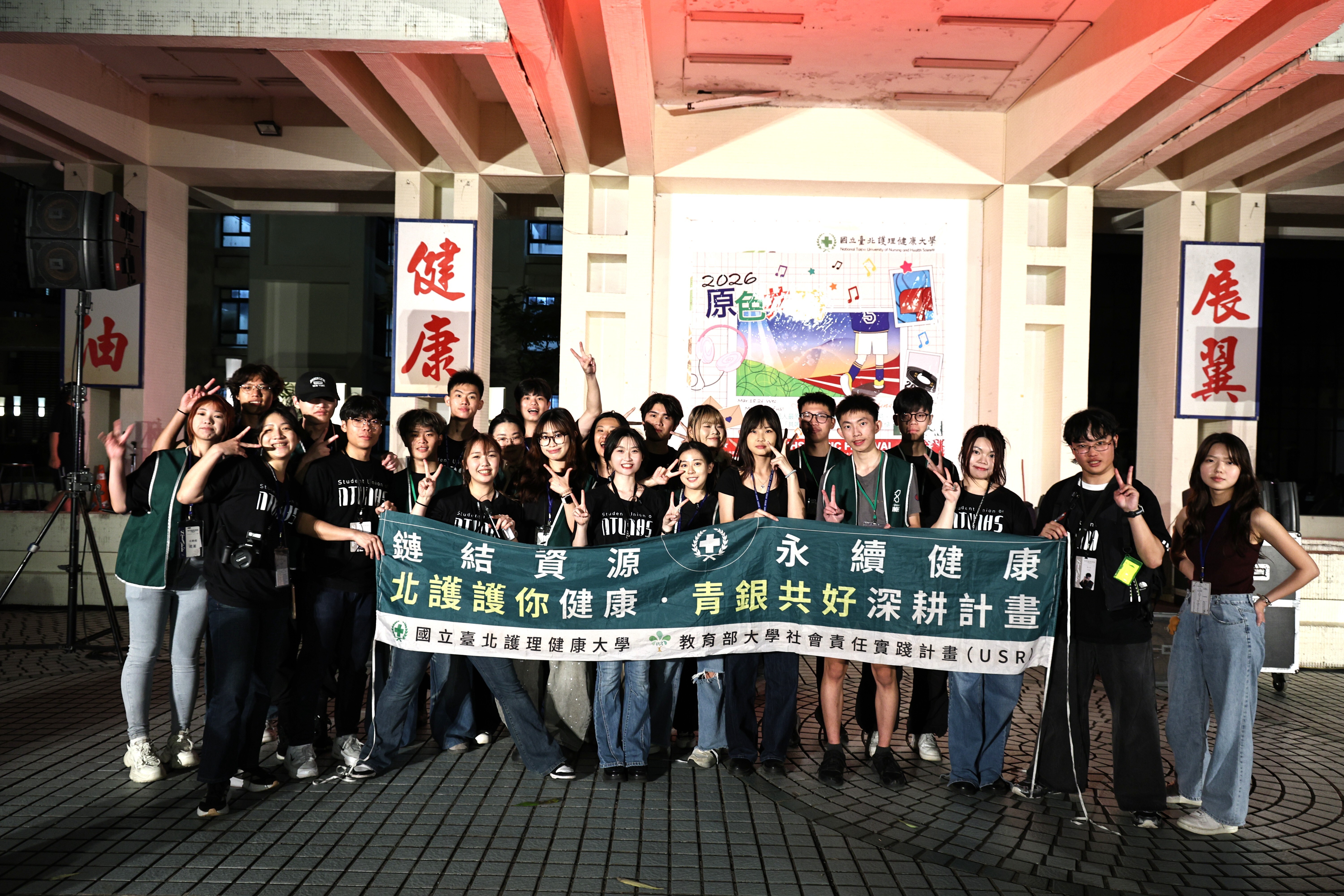 北護大吳淑芳校長(左五)、宋貞儀學務長(左六)、蘇義泰主秘(左七)、護理系魏秀靜副主任(左四)、課指組邱怡婷組長(左三)與北護大學生會共同揭開序幕