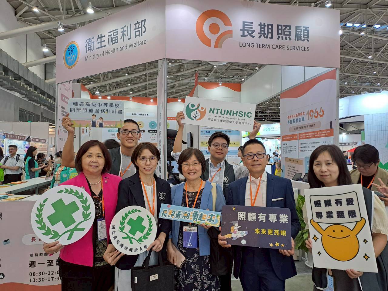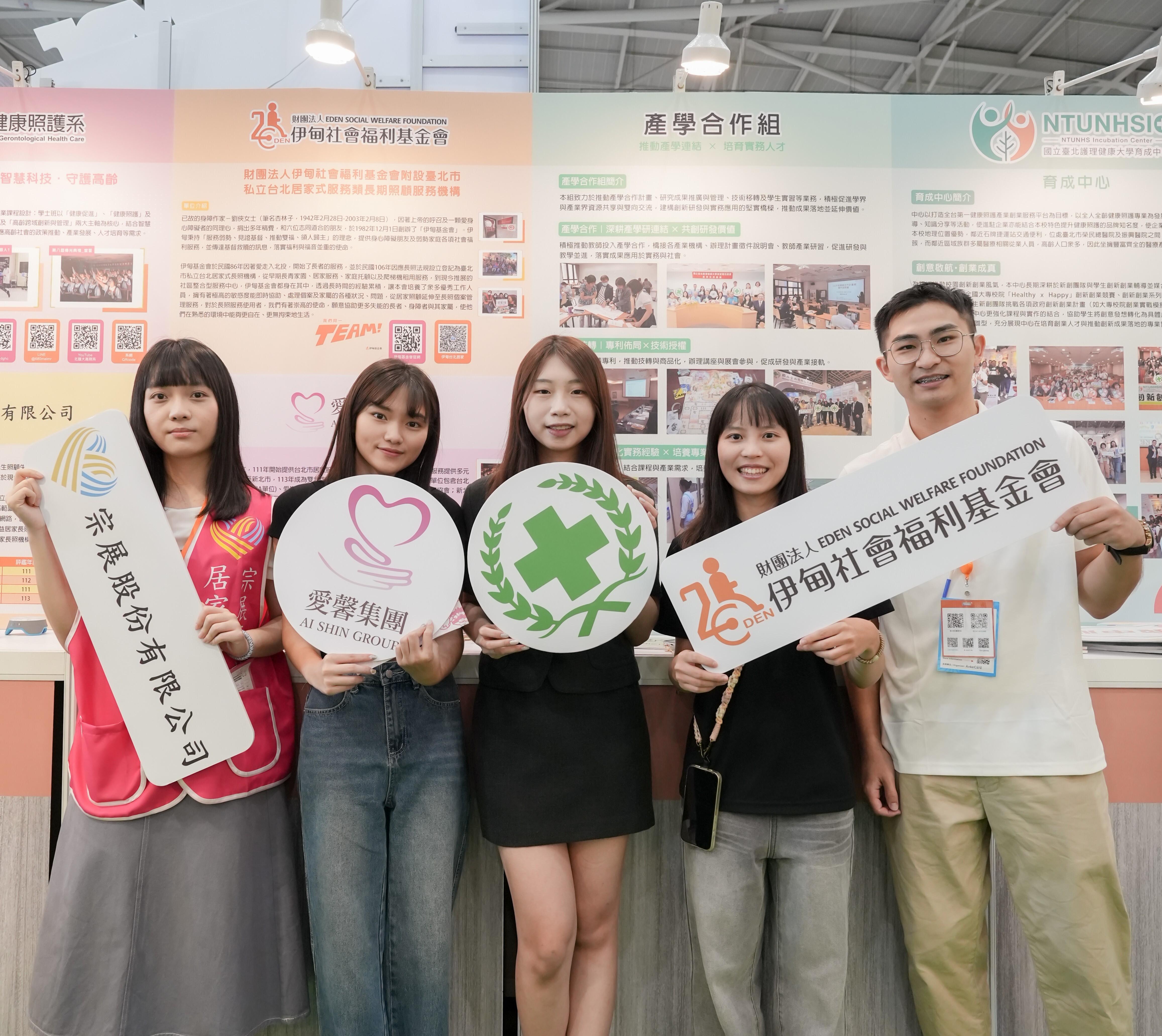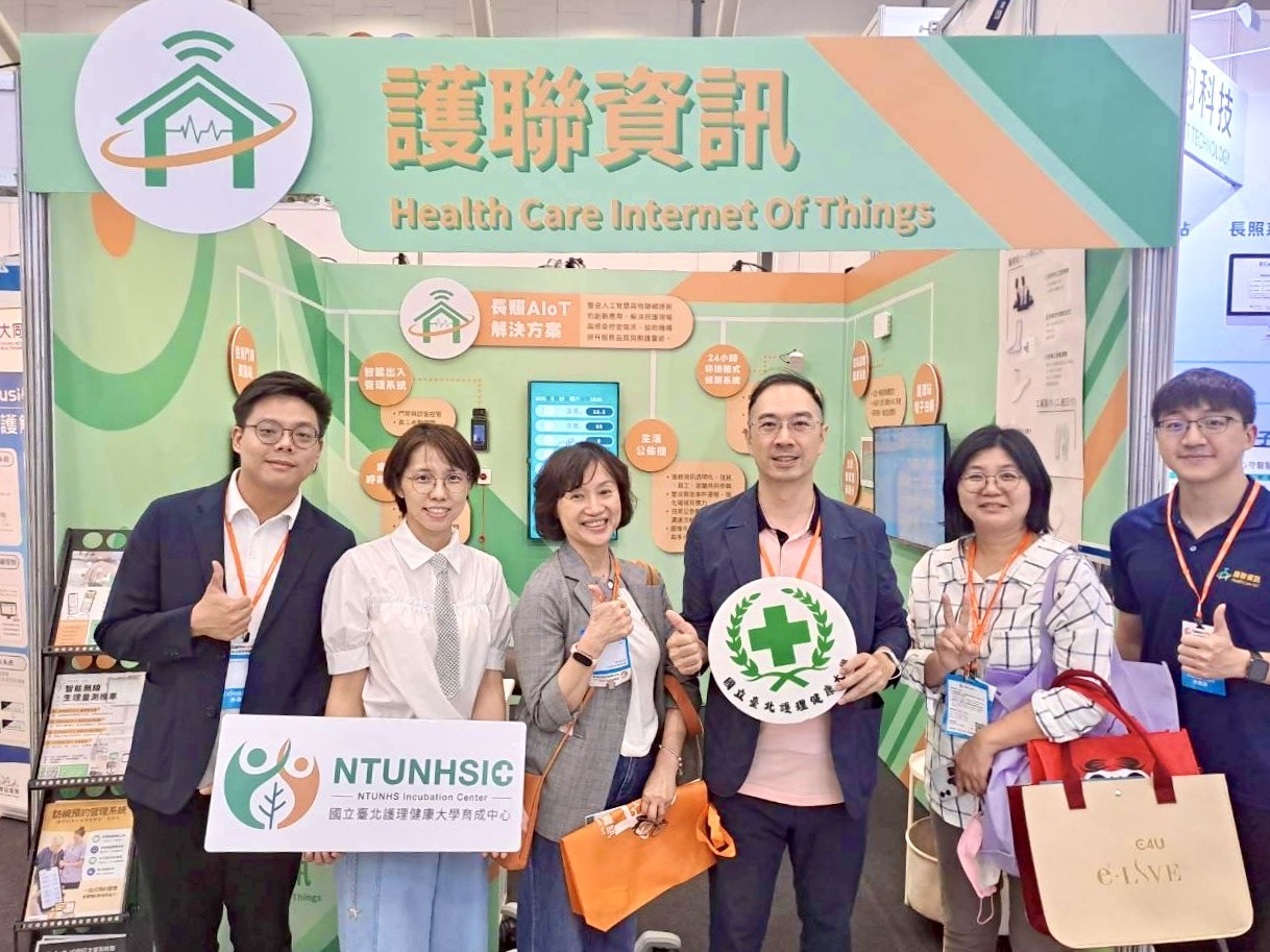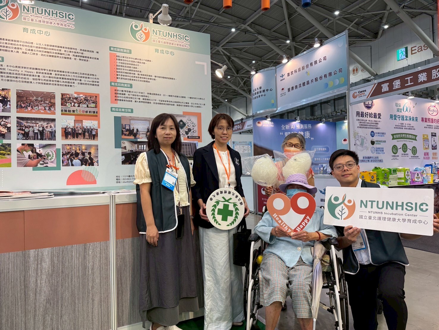 北護大2025(第六屆)台北國際照顧博覽會參展團隊合影(左起:伊甸基金會李維欣主任、北護大育成中心陳書毓主任、高照系蔡君明教授、和鄰居家護理所邱青萸創辦人與參展團隊同仁合影)