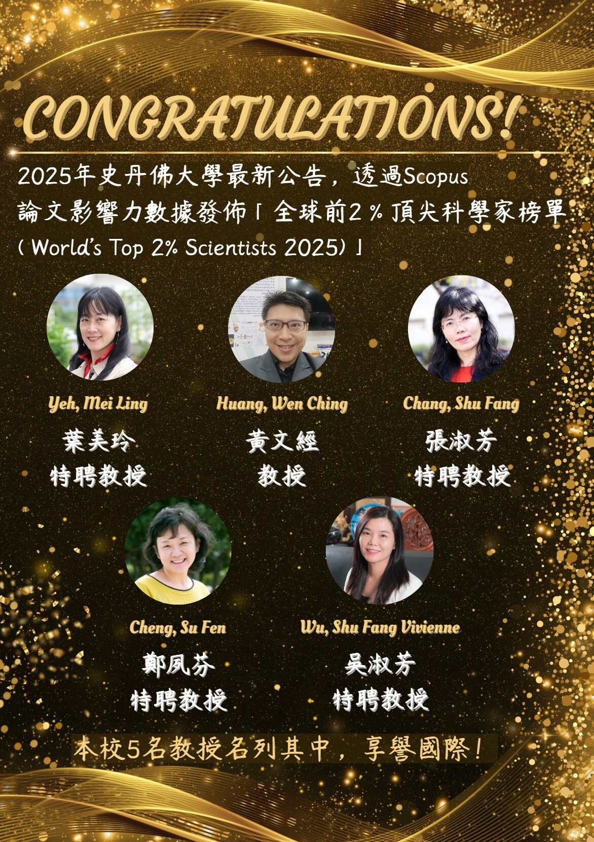 2025年美國史丹佛大學專家團隊從全球百萬名科學家中,遴選發布「全球前2% 頂尖科學家榜單(World's Top 2% Scientists 2025)」,北護大在校慶當日由魏崢院長頒獎護理系葉美玲特聘教授、張淑芳特聘教授、吳淑芳特聘教授、運動保健系黃文經教授、醫護教育暨數位學習系鄭夙芬特聘教授等5位享譽國際教授。