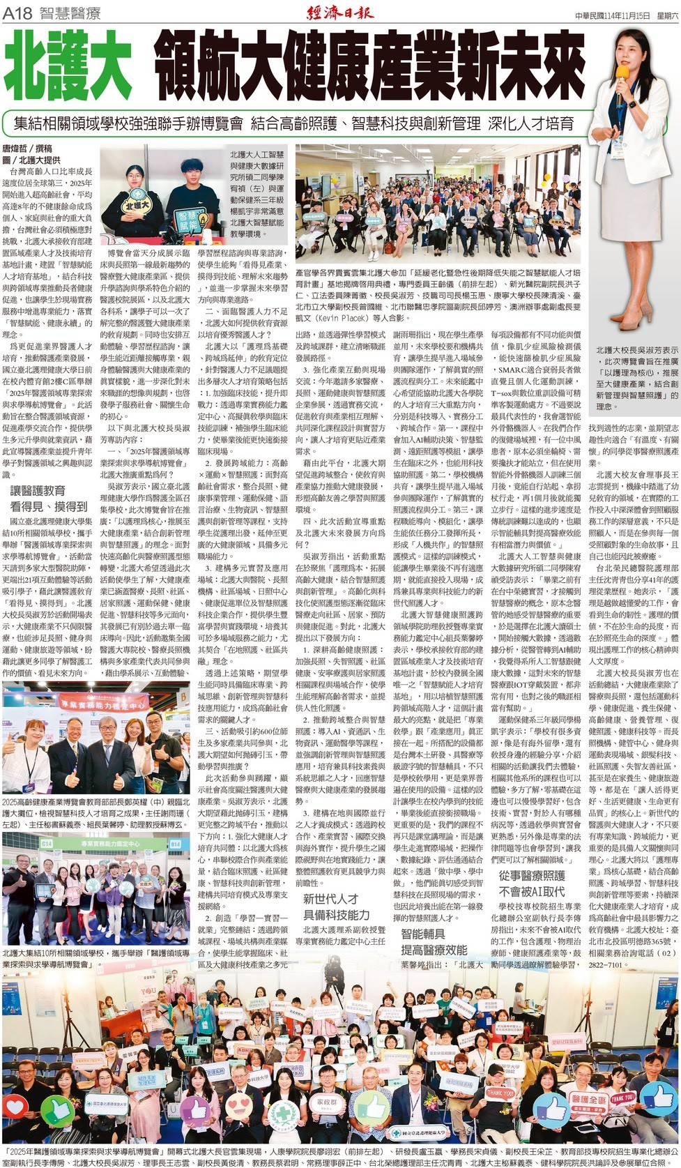 展望未來,國立臺北護理健康大學將持續扮演醫護教育推動的重要樞紐,與各夥伴學校及產業單位攜手合作,深化區域醫護與大健康人才培育網絡,推動跨域整合與實務導向的學習模式。學校也將持續舉辦多元探索與體驗活動,協助青年學子了解醫護職涯的真實面貌,啟發其服務社會、關懷生命的初心。藉由教育現場與大健康產業實務的緊密連結,培育具備專業能力、人文素養與社會責任的醫護人才,並推動大健康產業的創新發展。透過這樣的跨界合作,北護大期許能為臺灣的大健康產業注入更多創新力量,讓其在未來持續茁壯,為全民的健康幸福貢獻更深遠的力量。